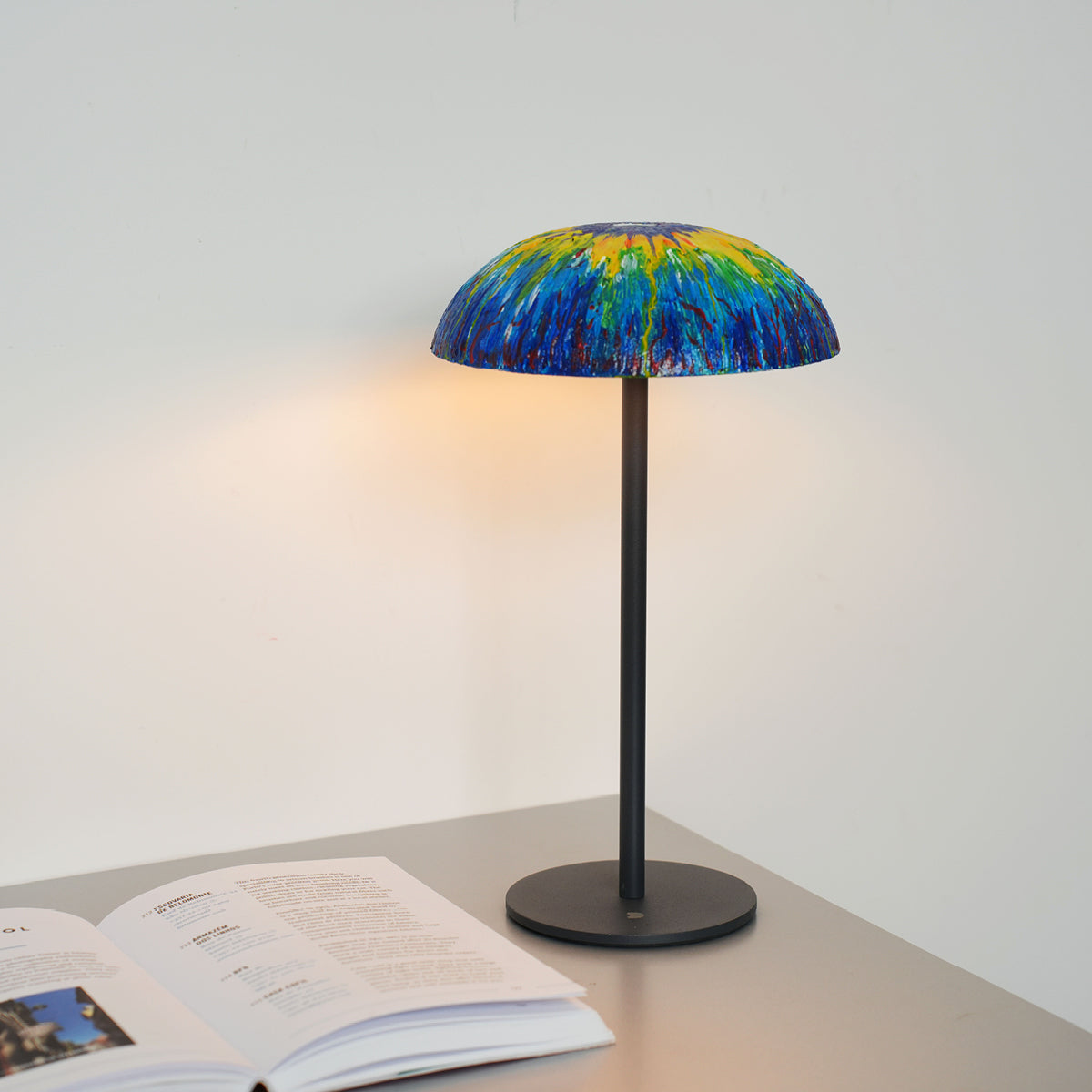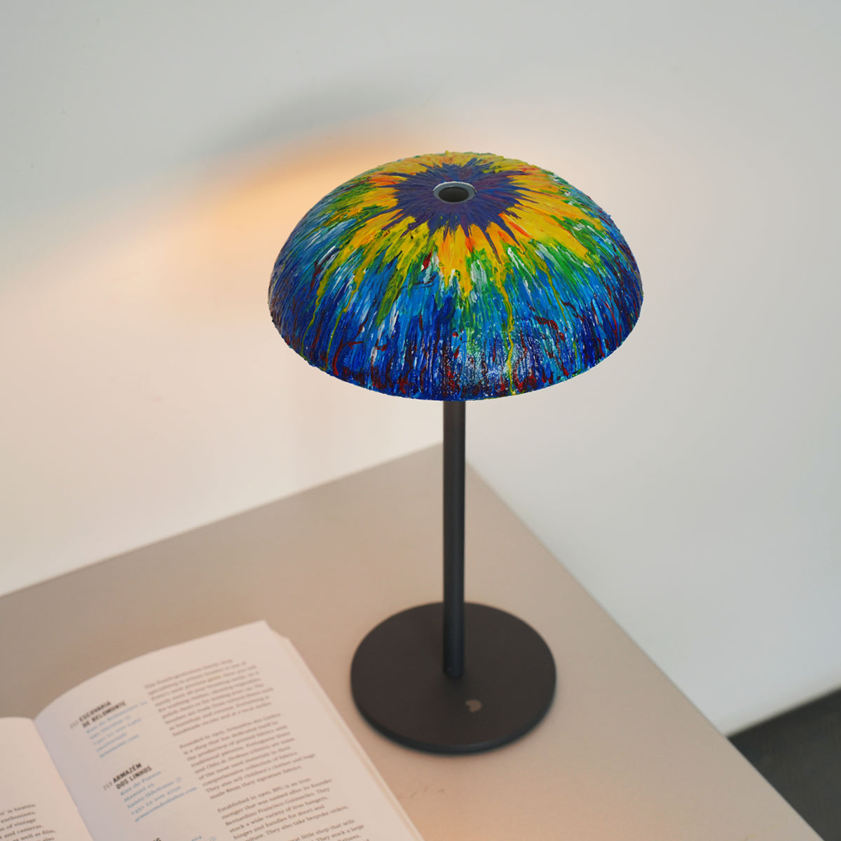 The Aurora Eye Lamp flashes rainforest greens, sunrise yellows and deep-indigo violets outward from a midnight pupil—like the northern lights captured inside an iris. Tap the stem and a gentle 2700 K glow spills over your desk, studio or bedside—vibrant, protective, mood-lifting.